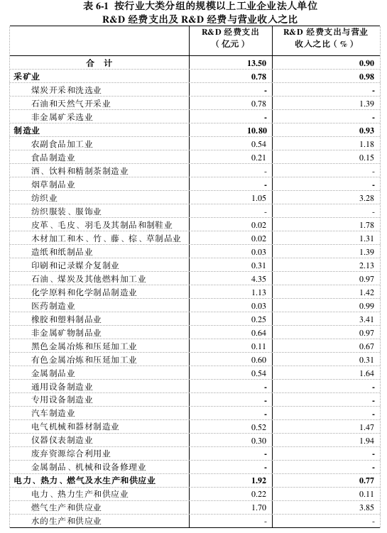 2023年,规模以上工业企业法人单位R&D经费支出13.50亿元,比2018年增长132.8%;R&D经费与营业收入之比为0.9%(详见表6-1)。